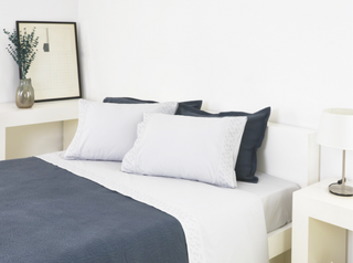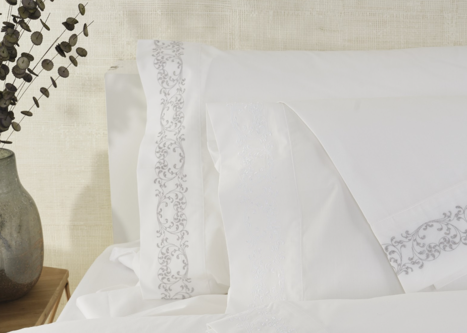 Los juegos de sábanas modelo Lyra y Orion se destacan por su delicado bordado blanco en las esquinas de la sábana encimera y en las fundas de almohada, aportando un toque de elegancia sutil y atemporal a tu dormitorio.